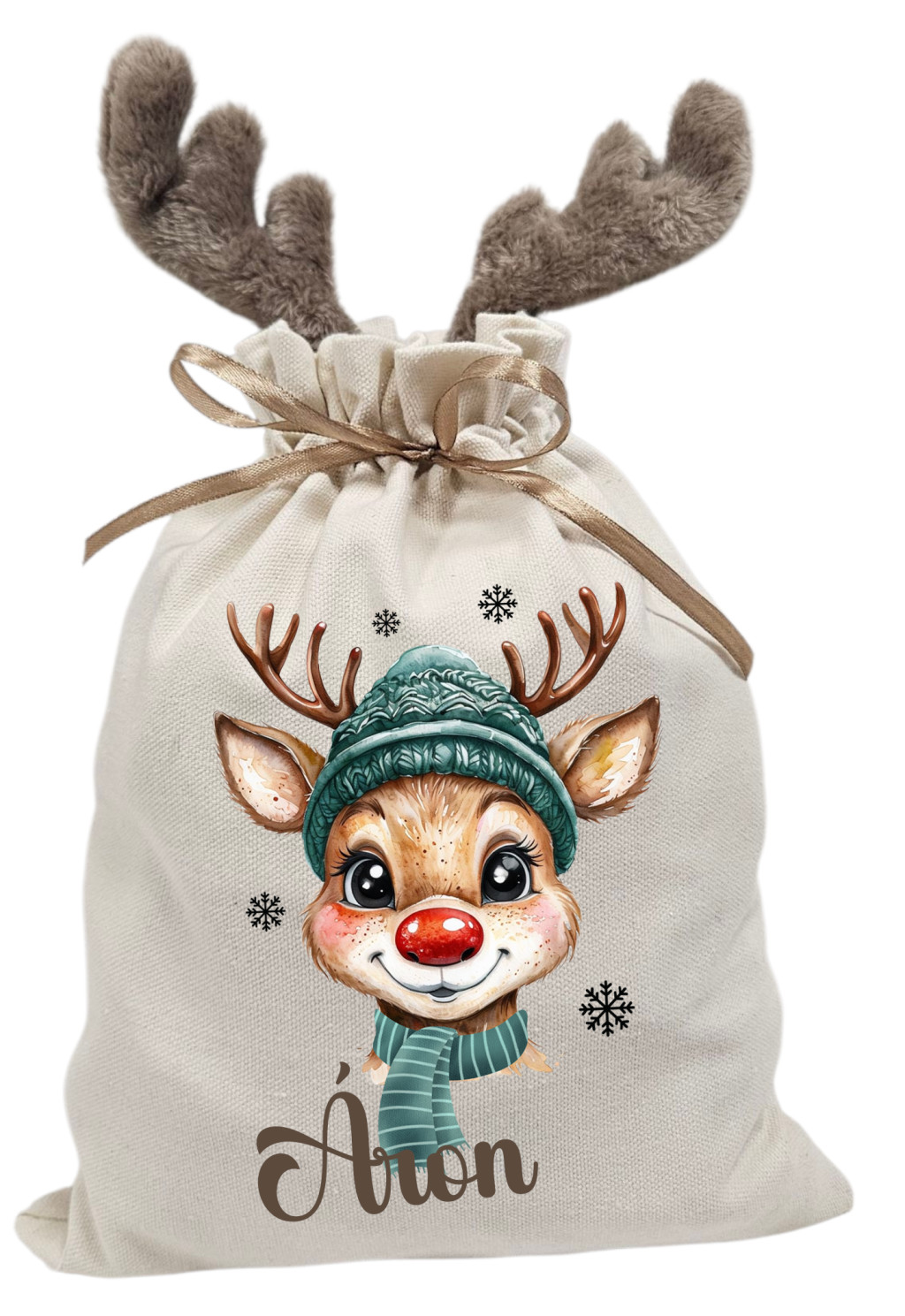 Fiús sálas rénszarvas, névre szóló agancsos mikulászsák - vászon