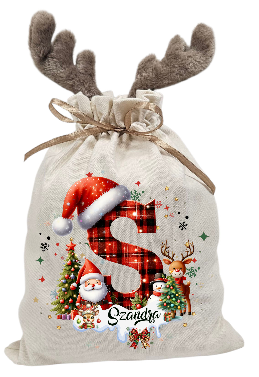 Kezdőbetűs_02, névre szóló rénszarvas agancsos mikulászsák - vászon