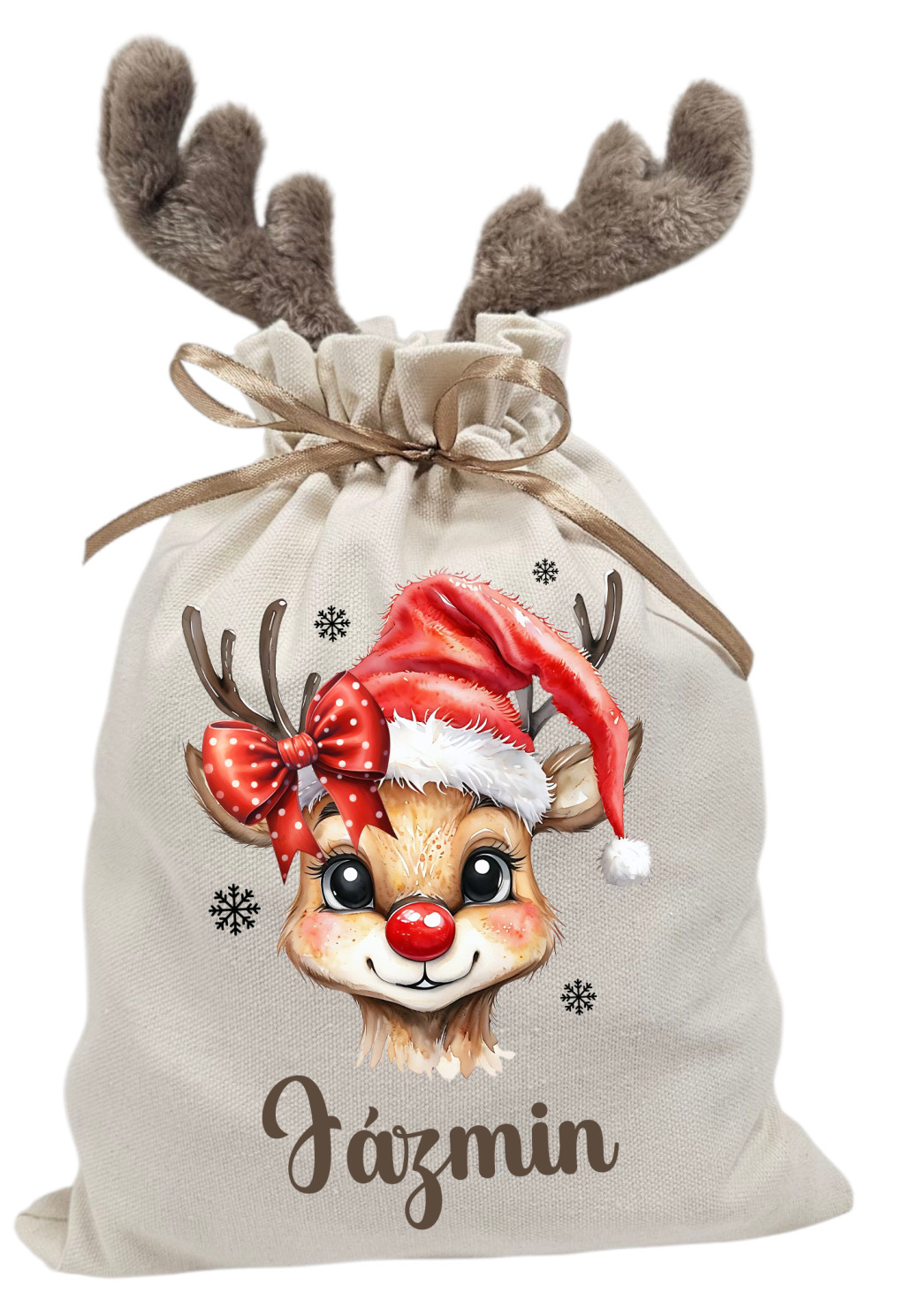 Lányos masnis rénszarvas, névre szóló  agancsos mikulászsák - vászon