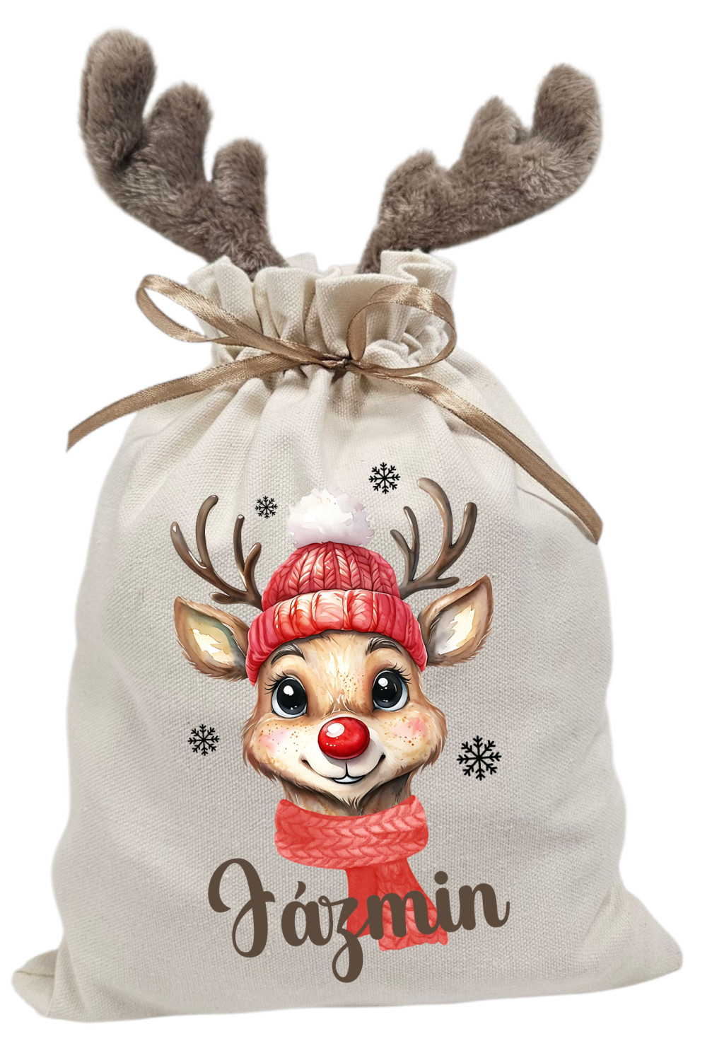 Lányos sálas rénszarvas, névre szóló  agancsos mikulászsák - vászon