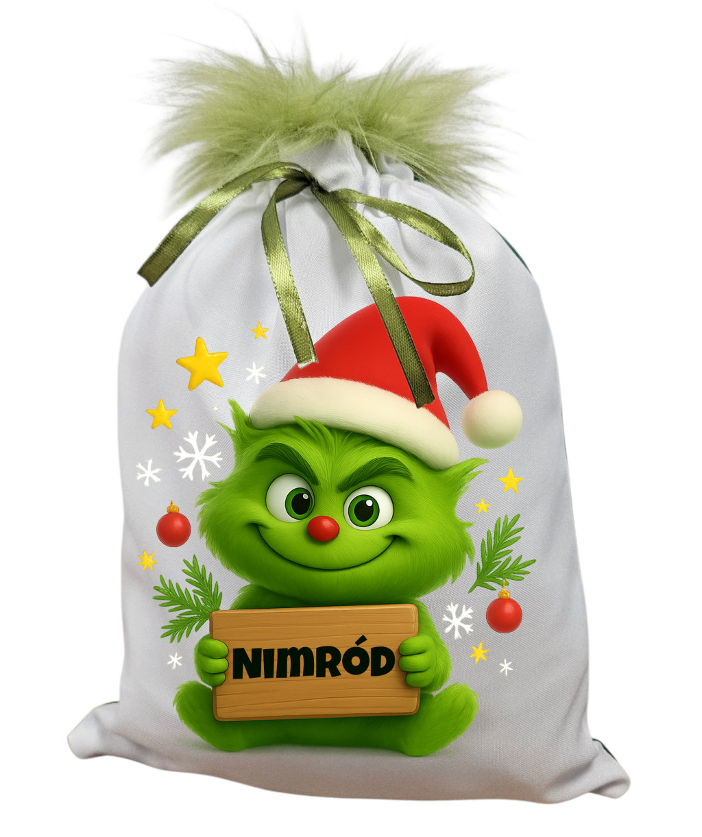 Névreszóló BabaGrincs mikulászsák zöld hátoldallal, műszőrrel
