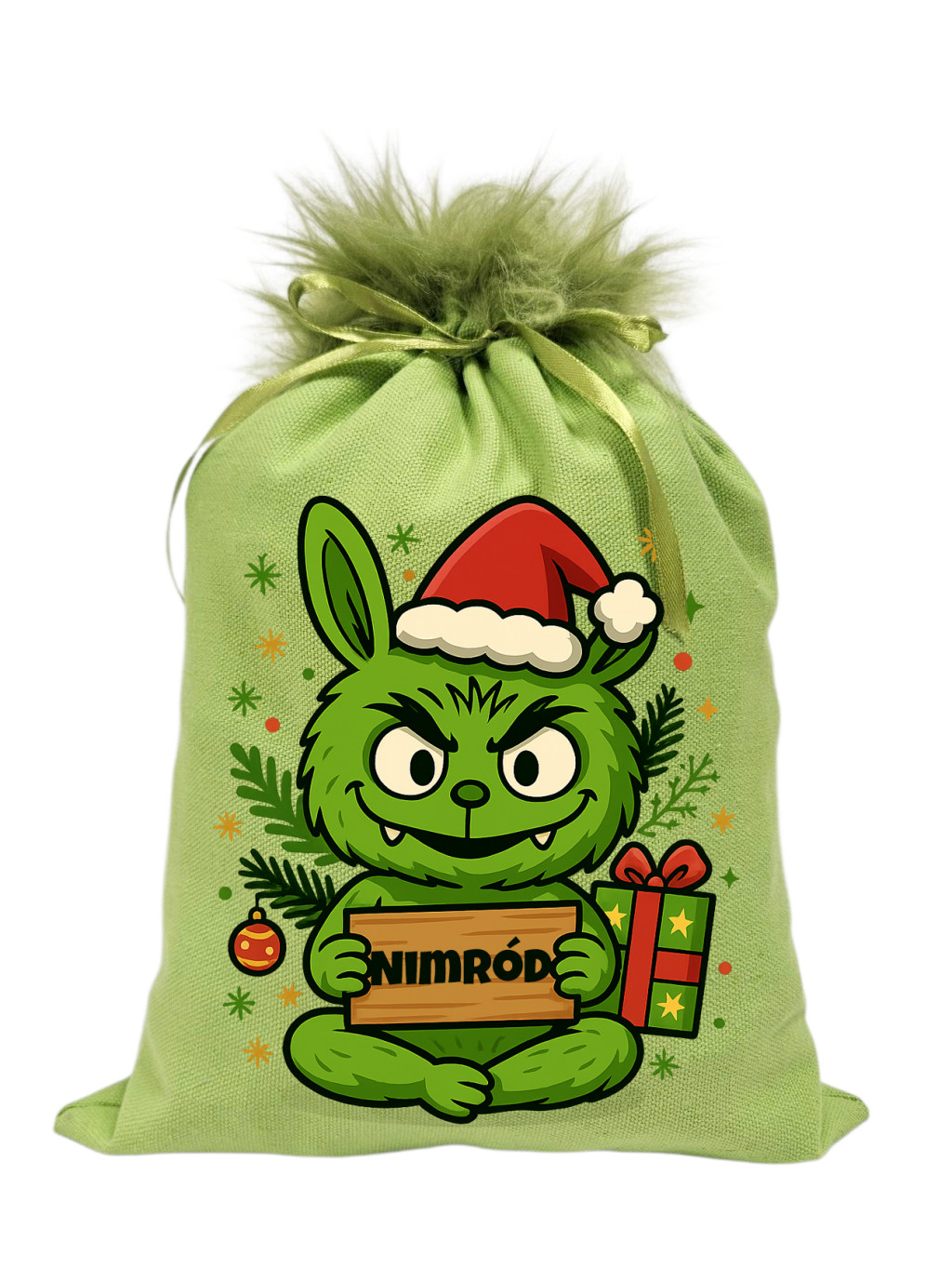 Névreszóló Grincsbubu mikulászsák zöld, műszőrrel - vászon