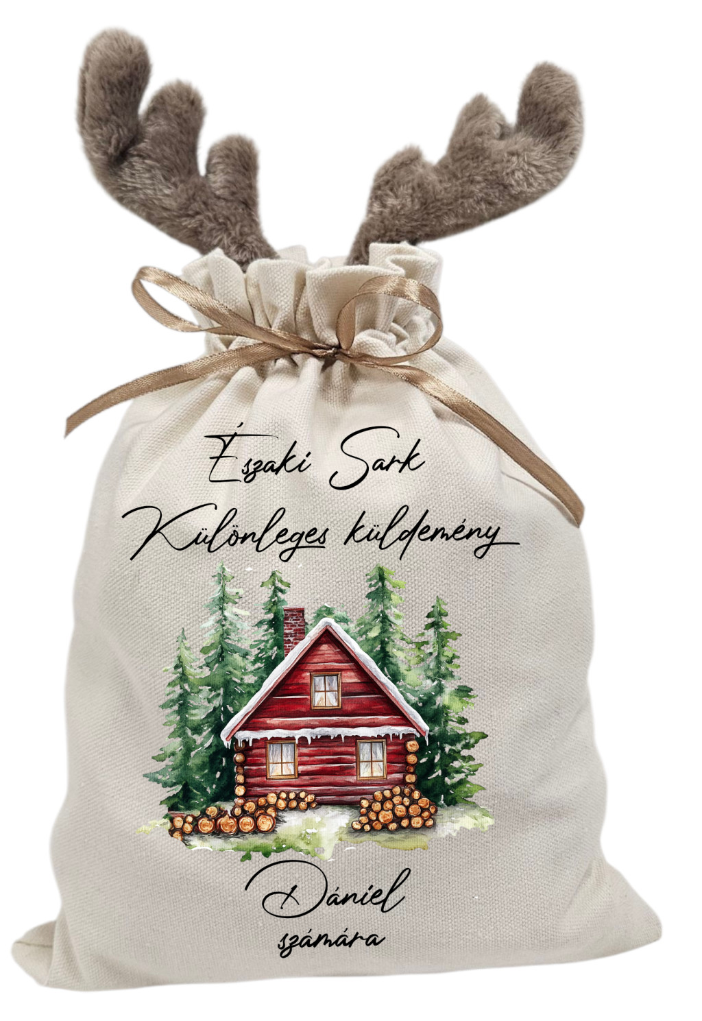 Vintage házikó, névre szóló  rénszarvas agancsos mikulászsák - vászon