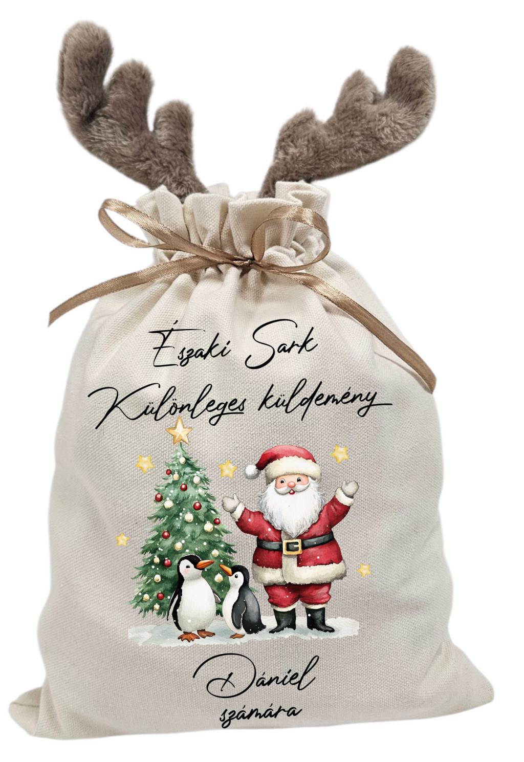Vintage mikulás pingvinnel, névre szóló  rénszarvas agancsos mikulászsák - vászon