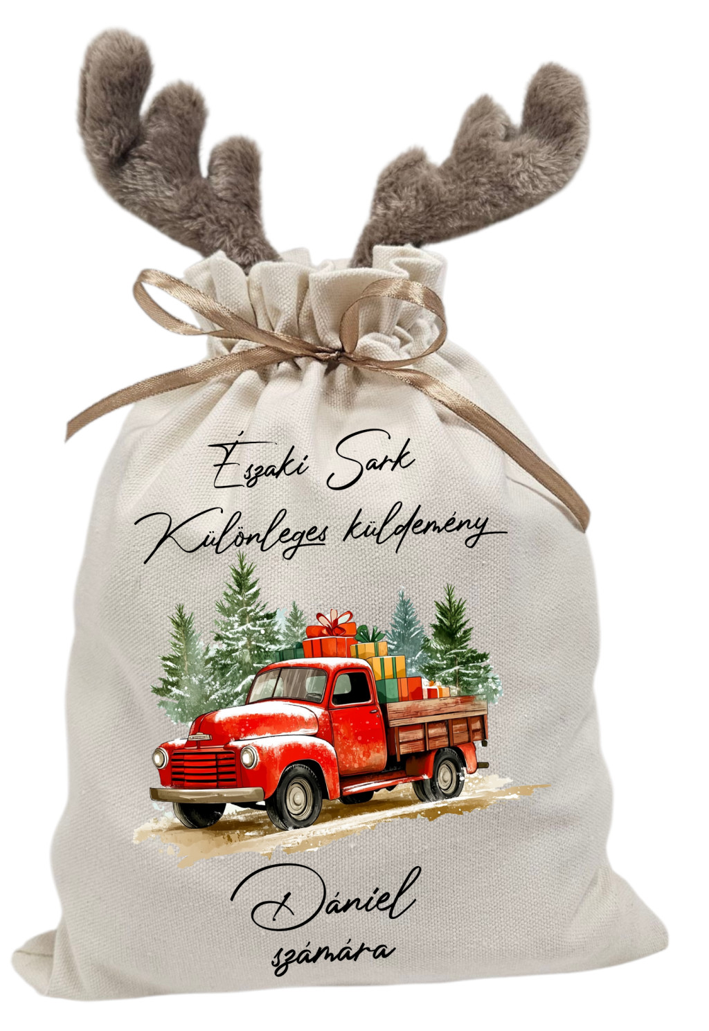 Vintage teherautó, névre szóló rénszarvas agancsos mikulászsák - vászon